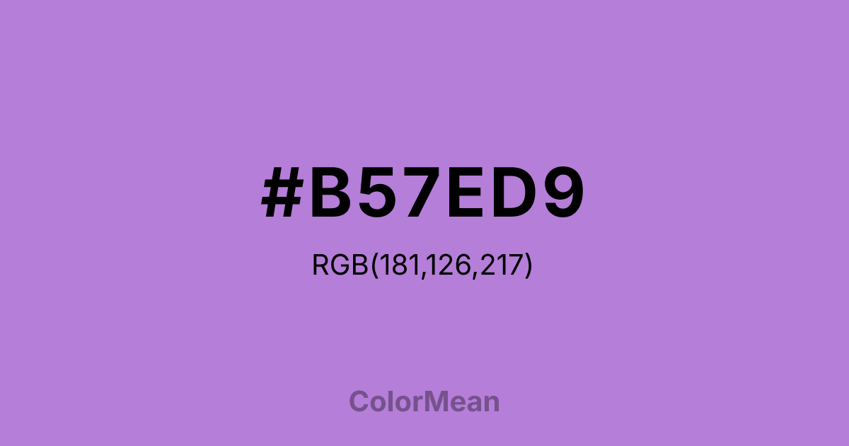 #B57ED9 RGB value is (181, 126, 217). The hex color red value is 181, green is 126, and blue is 217. Its HSL format shows a hue of 276°, saturation of 54 percent, and lightness of 67 percent. The CMYK process values are 17 percent, 42 percent, 0 percent, 15 percent.
