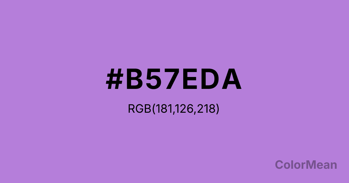 #B57EDA RGB value is (181, 126, 218). The hex color red value is 181, green is 126, and blue is 218. Its HSL format shows a hue of 276°, saturation of 55 percent, and lightness of 67 percent. The CMYK process values are 17 percent, 42 percent, 0 percent, 15 percent.