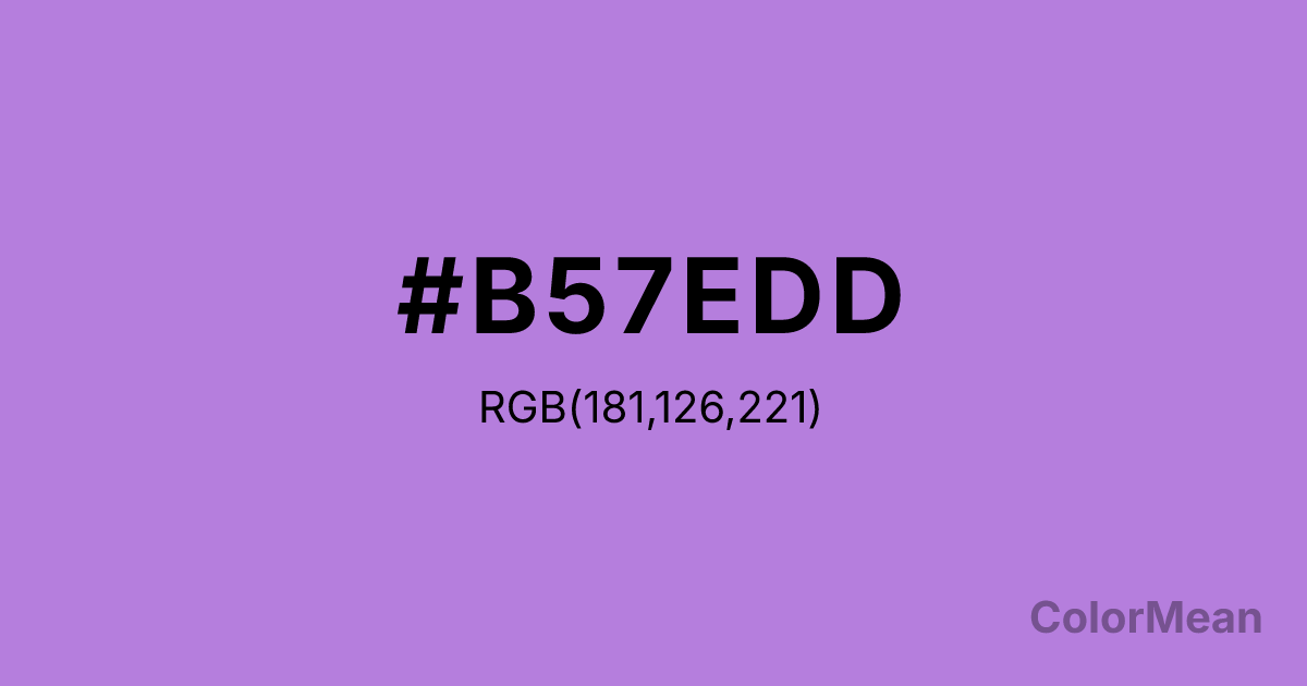 #B57EDD RGB value is (181, 126, 221). The hex color red value is 181, green is 126, and blue is 221. Its HSL format shows a hue of 275°, saturation of 58 percent, and lightness of 68 percent. The CMYK process values are 18 percent, 43 percent, 0 percent, 13 percent.