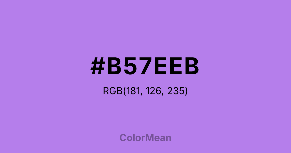 #B57EEB RGB value is (181, 126, 235). The hex color red value is 181, green is 126, and blue is 235. Its HSL format shows a hue of 270°, saturation of 73 percent, and lightness of 71 percent. The CMYK process values are 23 percent, 46 percent, 0 percent, 8 percent.