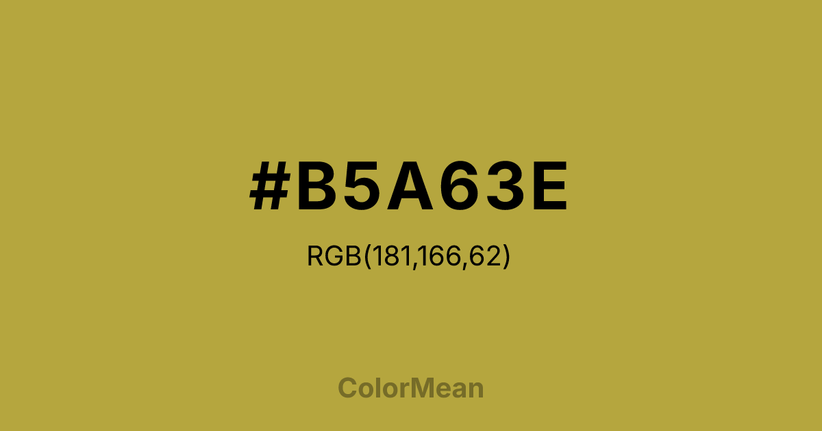 #B5A63E RGB value is (181, 166, 62). The hex color red value is 181, green is 166, and blue is 62. Its HSL format shows a hue of 52°, saturation of 49 percent, and lightness of 48 percent. The CMYK process values are 0 percent, 8 percent, 66 percent, 29 percent.
