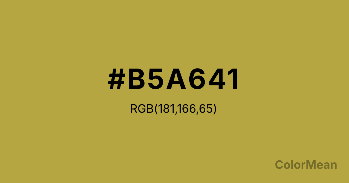 #B5A641 RGB value is (181, 166, 65). The hex color red value is 181, green is 166, and blue is 65. Its HSL format shows a hue of 52°, saturation of 47 percent, and lightness of 48 percent. The CMYK process values are 0 percent, 8 percent, 64 percent, 29 percent.