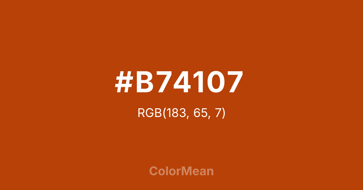 #B74107 RGB value is (183, 65, 7). The hex color red value is 183, green is 65, and blue is 7. Its HSL format shows a hue of 20°, saturation of 93 percent, and lightness of 37 percent. The CMYK process values are 0 percent, 64 percent, 96 percent, 28 percent.