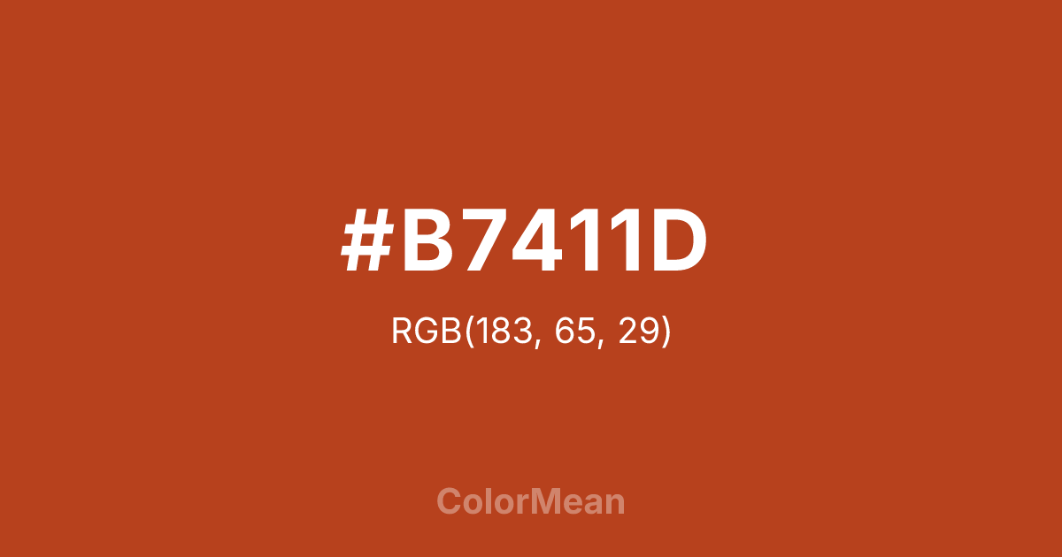 #B7411D RGB value is (183, 65, 29). The hex color red value is 183, green is 65, and blue is 29. Its HSL format shows a hue of 14°, saturation of 73 percent, and lightness of 42 percent. The CMYK process values are 0 percent, 64 percent, 84 percent, 28 percent.