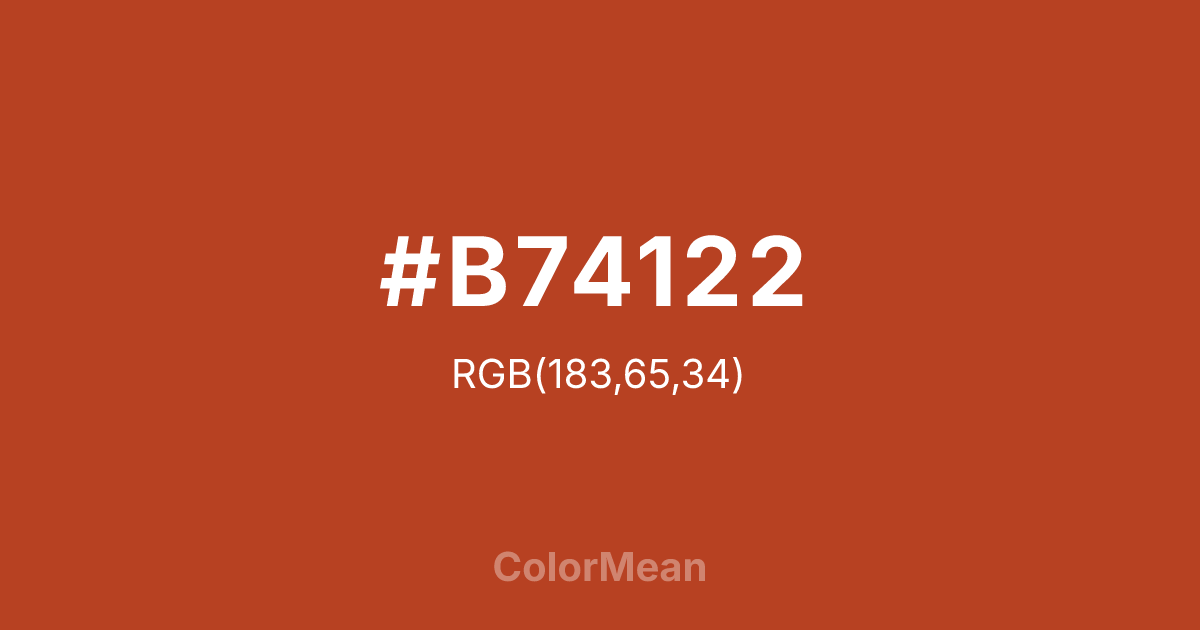 #B74122 RGB value is (183, 65, 34). The hex color red value is 183, green is 65, and blue is 34. Its HSL format shows a hue of 12°, saturation of 69 percent, and lightness of 43 percent. The CMYK process values are 0 percent, 64 percent, 81 percent, 28 percent.