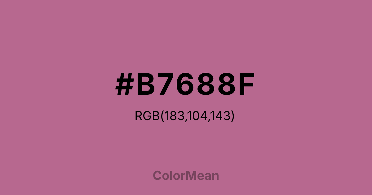 #B7688F RGB value is (183, 104, 143). The hex color red value is 183, green is 104, and blue is 143. Its HSL format shows a hue of 330°, saturation of 35 percent, and lightness of 56 percent. The CMYK process values are 0 percent, 43 percent, 22 percent, 28 percent.