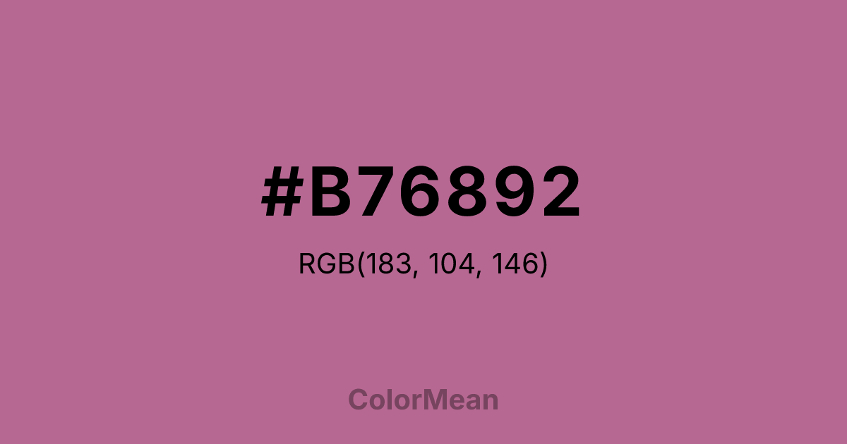 #B76892 RGB value is (183, 104, 146). The hex color red value is 183, green is 104, and blue is 146. Its HSL format shows a hue of 328°, saturation of 35 percent, and lightness of 56 percent. The CMYK process values are 0 percent, 43 percent, 20 percent, 28 percent.