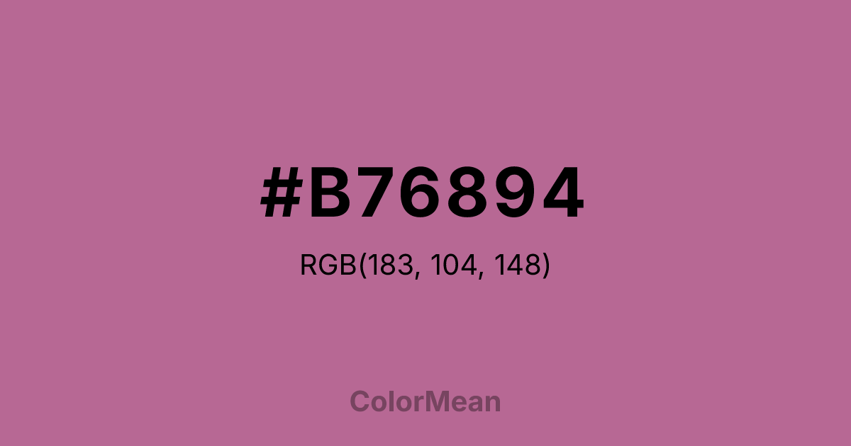 #B76894 RGB value is (183, 104, 148). The hex color red value is 183, green is 104, and blue is 148. Its HSL format shows a hue of 327°, saturation of 35 percent, and lightness of 56 percent. The CMYK process values are 0 percent, 43 percent, 19 percent, 28 percent.