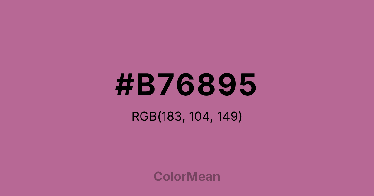 #B76895 RGB value is (183, 104, 149). The hex color red value is 183, green is 104, and blue is 149. Its HSL format shows a hue of 326°, saturation of 35 percent, and lightness of 56 percent. The CMYK process values are 0 percent, 43 percent, 19 percent, 28 percent.
