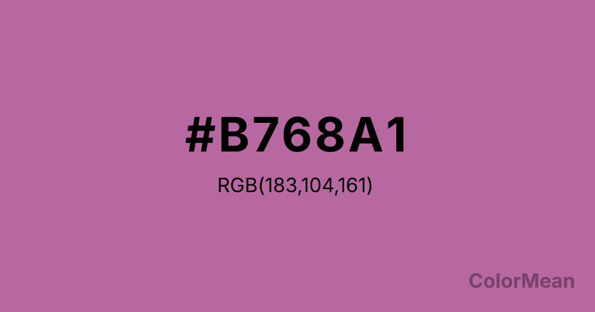 #B768A1 RGB value is (183, 104, 161). The hex color red value is 183, green is 104, and blue is 161. Its HSL format shows a hue of 317°, saturation of 35 percent, and lightness of 56 percent. The CMYK process values are 0 percent, 43 percent, 12 percent, 28 percent.