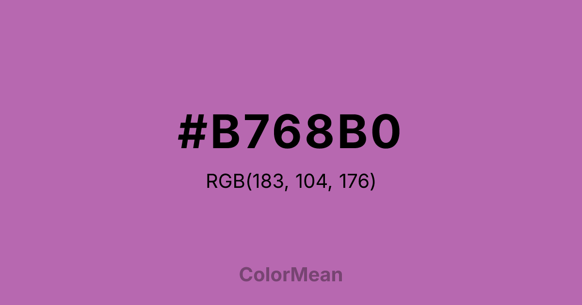 #B768B0 RGB value is (183, 104, 176). The hex color red value is 183, green is 104, and blue is 176. Its HSL format shows a hue of 305°, saturation of 35 percent, and lightness of 56 percent. The CMYK process values are 0 percent, 43 percent, 4 percent, 28 percent.