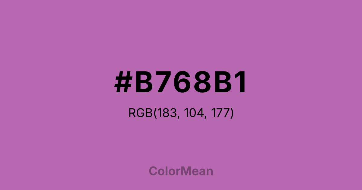 #B768B1 RGB value is (183, 104, 177). The hex color red value is 183, green is 104, and blue is 177. Its HSL format shows a hue of 305°, saturation of 35 percent, and lightness of 56 percent. The CMYK process values are 0 percent, 43 percent, 3 percent, 28 percent.