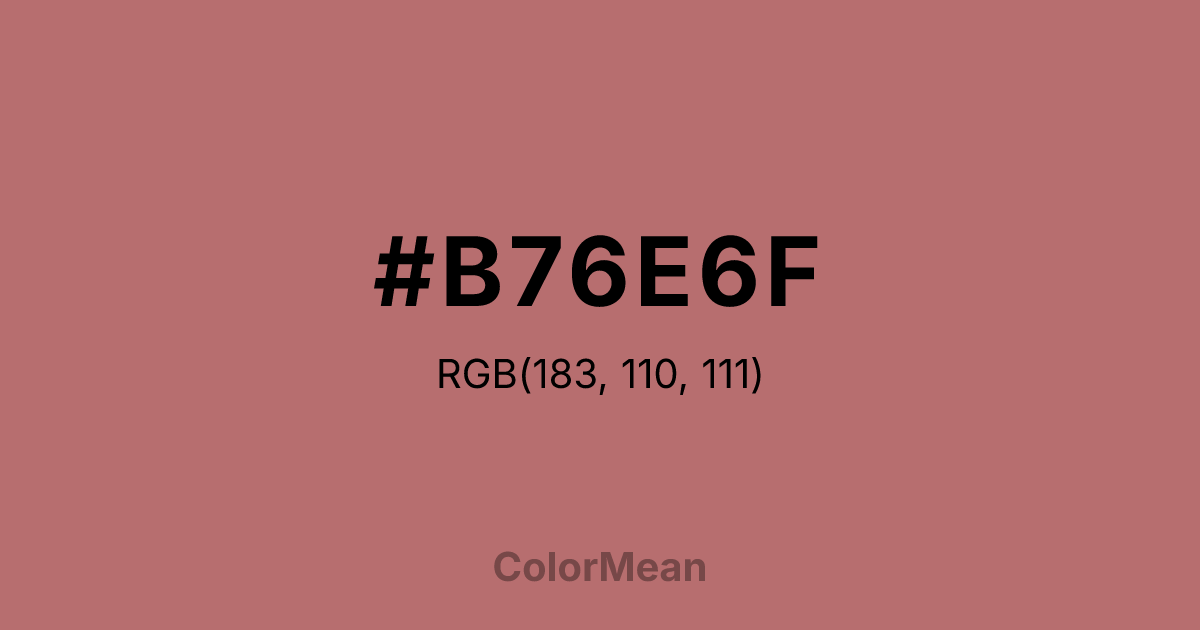 #B76E6F RGB value is (183, 110, 111). The hex color red value is 183, green is 110, and blue is 111. Its HSL format shows a hue of 359°, saturation of 34 percent, and lightness of 57 percent. The CMYK process values are 0 percent, 40 percent, 39 percent, 28 percent.