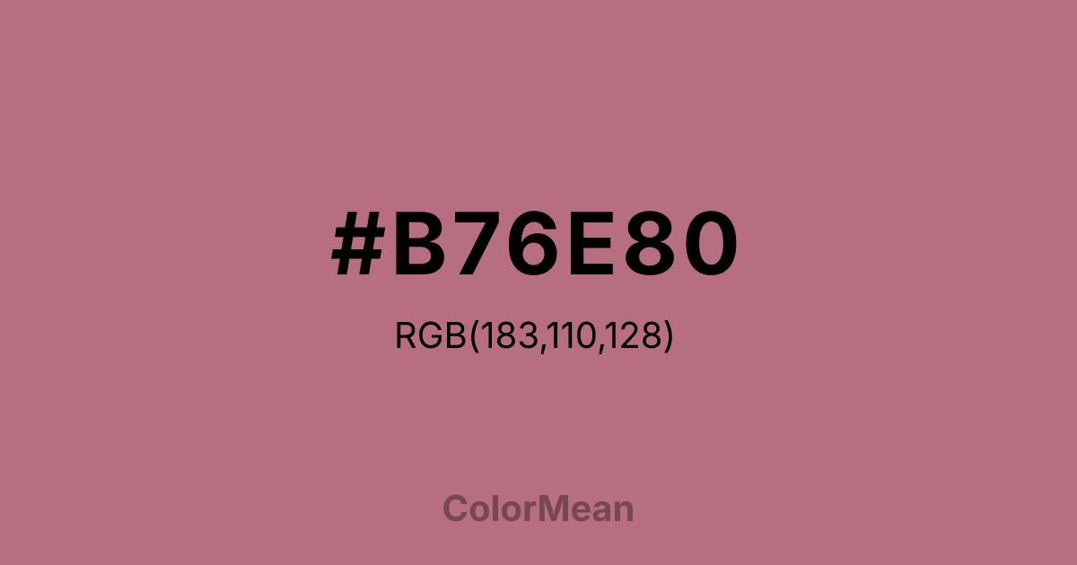 #B76E80 RGB value is (183, 110, 128). The hex color red value is 183, green is 110, and blue is 128. Its HSL format shows a hue of 345°, saturation of 34 percent, and lightness of 57 percent. The CMYK process values are 0 percent, 40 percent, 30 percent, 28 percent.