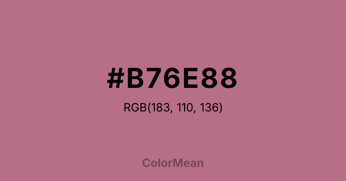 #B76E88 RGB value is (183, 110, 136). The hex color red value is 183, green is 110, and blue is 136. Its HSL format shows a hue of 339°, saturation of 34 percent, and lightness of 57 percent. The CMYK process values are 0 percent, 40 percent, 26 percent, 28 percent.