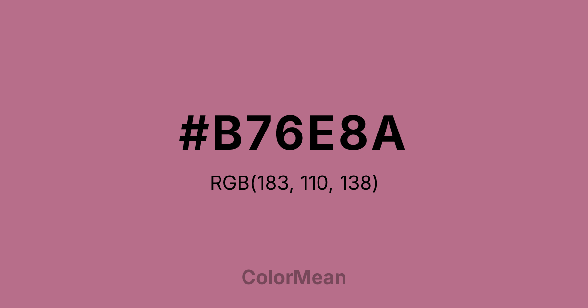 #B76E8A RGB value is (183, 110, 138). The hex color red value is 183, green is 110, and blue is 138. Its HSL format shows a hue of 337°, saturation of 34 percent, and lightness of 57 percent. The CMYK process values are 0 percent, 40 percent, 25 percent, 28 percent.