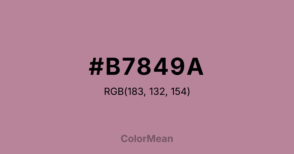 #B7849A RGB value is (183, 132, 154). The hex color red value is 183, green is 132, and blue is 154. Its HSL format shows a hue of 334°, saturation of 26 percent, and lightness of 62 percent. The CMYK process values are 0 percent, 28 percent, 16 percent, 28 percent.