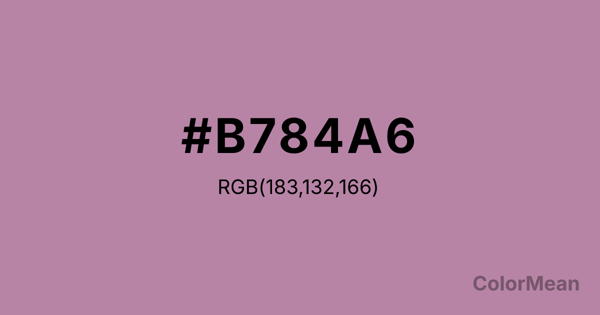 #B784A6 RGB value is (183, 132, 166). The hex color red value is 183, green is 132, and blue is 166. Its HSL format shows a hue of 320°, saturation of 26 percent, and lightness of 62 percent. The CMYK process values are 0 percent, 28 percent, 9 percent, 28 percent.