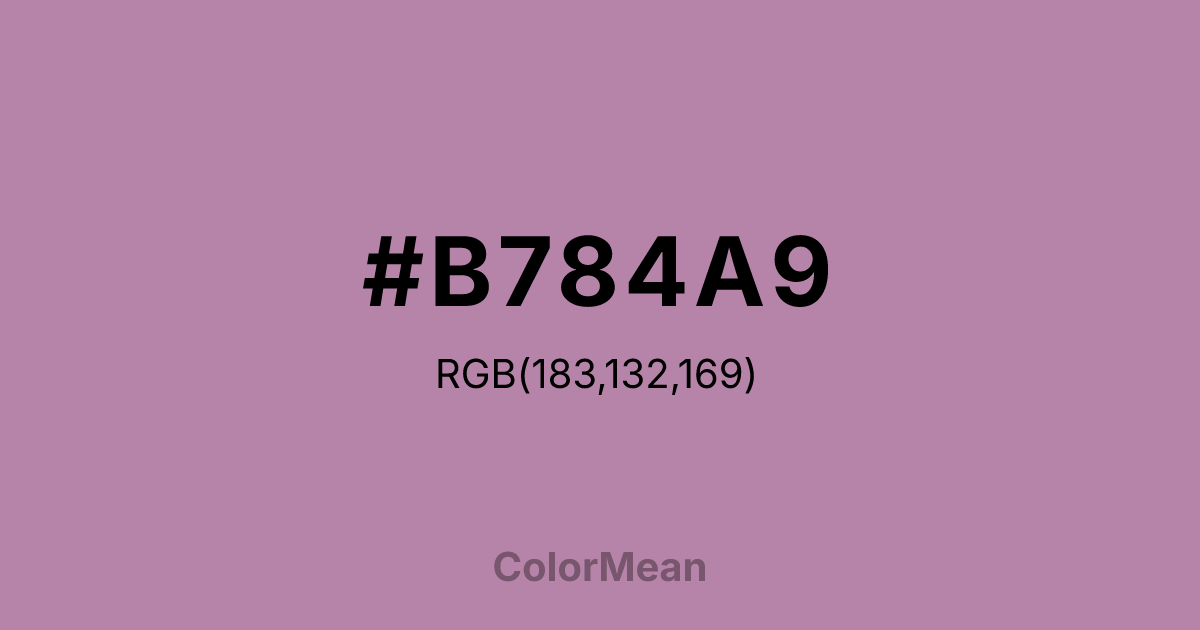 #B784A9 RGB value is (183, 132, 169). The hex color red value is 183, green is 132, and blue is 169. Its HSL format shows a hue of 316°, saturation of 26 percent, and lightness of 62 percent. The CMYK process values are 0 percent, 28 percent, 8 percent, 28 percent.