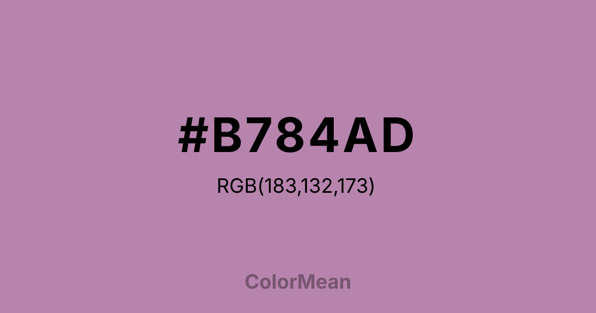 #B784AD RGB value is (183, 132, 173). The hex color red value is 183, green is 132, and blue is 173. Its HSL format shows a hue of 312°, saturation of 26 percent, and lightness of 62 percent. The CMYK process values are 0 percent, 28 percent, 5 percent, 28 percent.