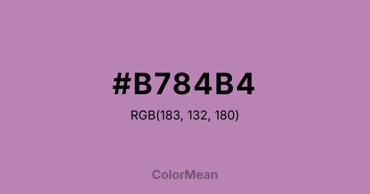 #B784B4 RGB value is (183, 132, 180). The hex color red value is 183, green is 132, and blue is 180. Its HSL format shows a hue of 304°, saturation of 26 percent, and lightness of 62 percent. The CMYK process values are 0 percent, 28 percent, 2 percent, 28 percent.