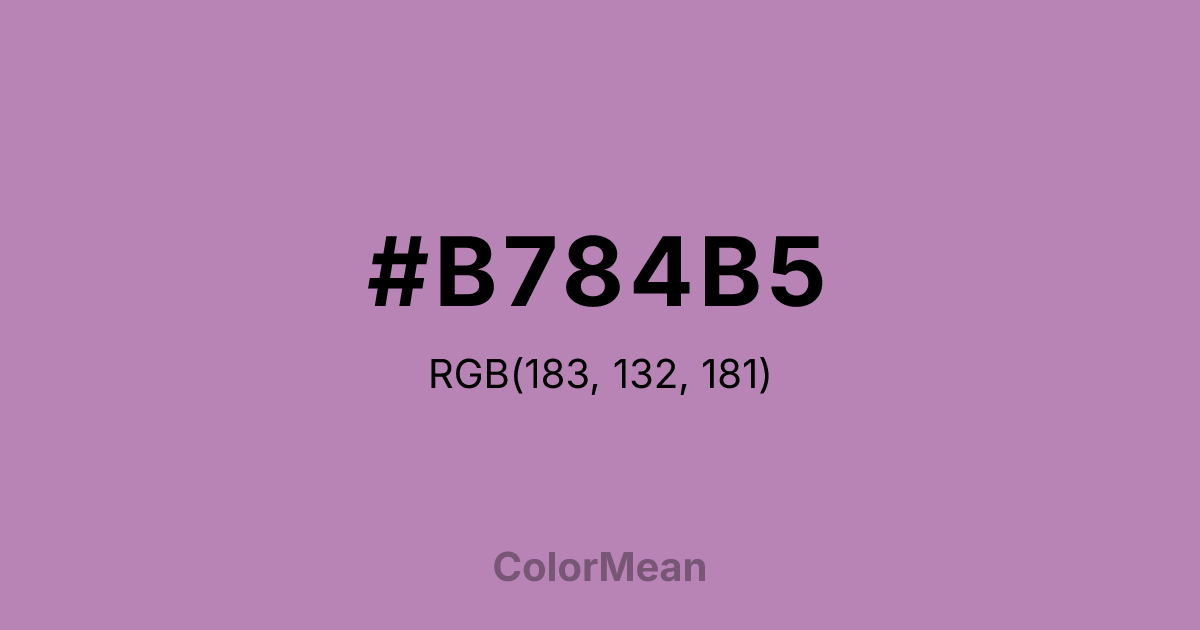 #B784B5 RGB value is (183, 132, 181). The hex color red value is 183, green is 132, and blue is 181. Its HSL format shows a hue of 302°, saturation of 26 percent, and lightness of 62 percent. The CMYK process values are 0 percent, 28 percent, 1 percent, 28 percent.