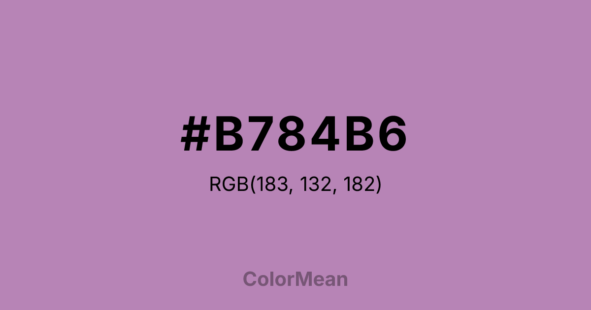#B784B6 RGB value is (183, 132, 182). The hex color red value is 183, green is 132, and blue is 182. Its HSL format shows a hue of 301°, saturation of 26 percent, and lightness of 62 percent. The CMYK process values are 0 percent, 28 percent, 1 percent, 28 percent.