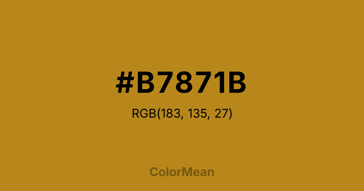 #B7871B RGB value is (183, 135, 27). The hex color red value is 183, green is 135, and blue is 27. Its HSL format shows a hue of 42°, saturation of 74 percent, and lightness of 41 percent. The CMYK process values are 0 percent, 26 percent, 85 percent, 28 percent.