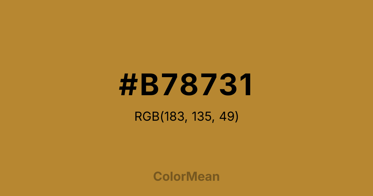 #B78731 RGB value is (183, 135, 49). The hex color red value is 183, green is 135, and blue is 49. Its HSL format shows a hue of 39°, saturation of 58 percent, and lightness of 45 percent. The CMYK process values are 0 percent, 26 percent, 73 percent, 28 percent.
