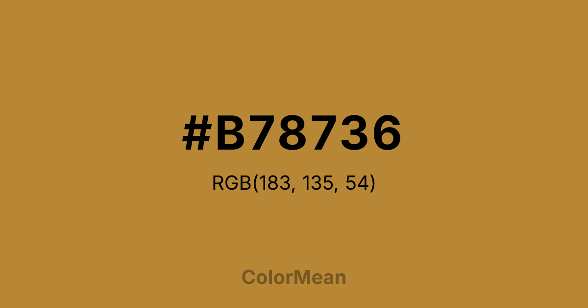 #B78736 RGB value is (183, 135, 54). The hex color red value is 183, green is 135, and blue is 54. Its HSL format shows a hue of 38°, saturation of 54 percent, and lightness of 46 percent. The CMYK process values are 0 percent, 26 percent, 70 percent, 28 percent.