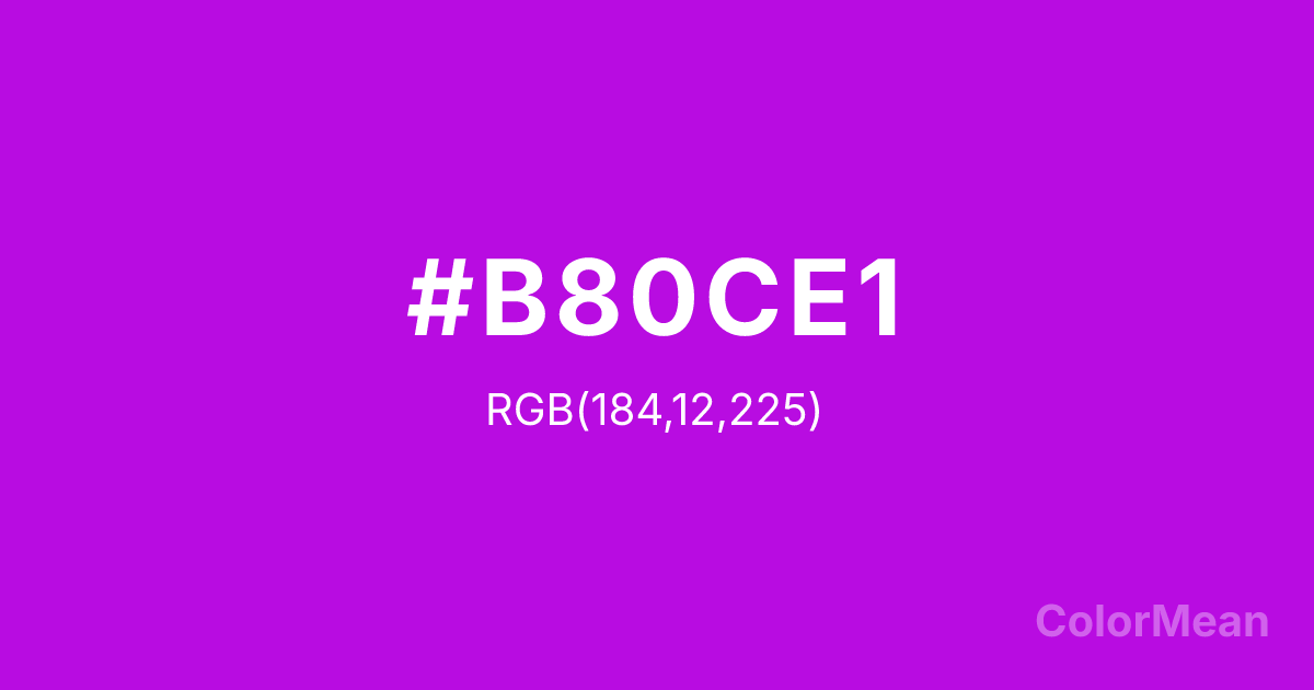 #B80CE1 RGB value is (184, 12, 225). The hex color red value is 184, green is 12, and blue is 225. Its HSL format shows a hue of 288°, saturation of 90 percent, and lightness of 46 percent. The CMYK process values are 18 percent, 95 percent, 0 percent, 12 percent.