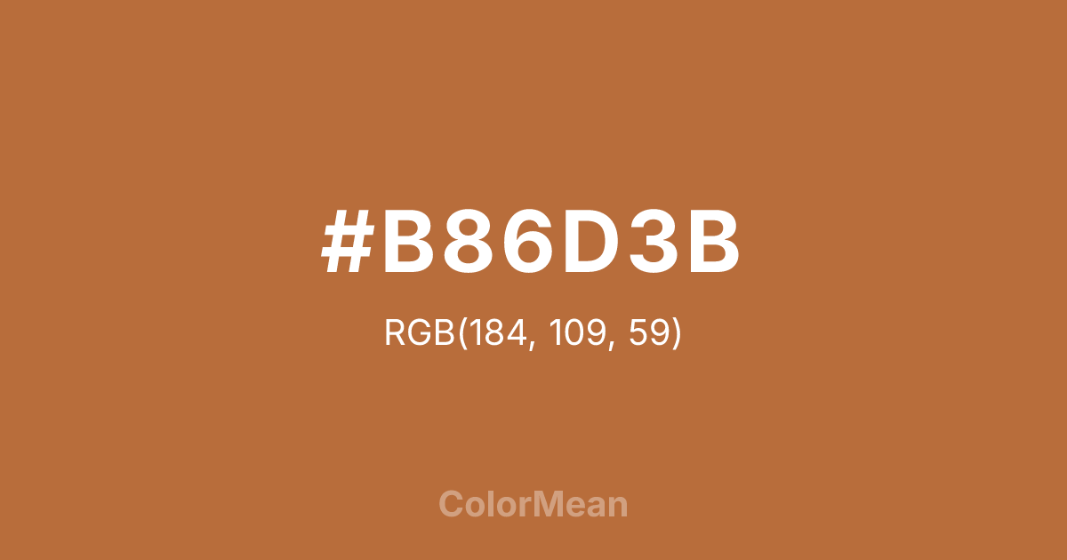 #B86D3B RGB value is (184, 109, 59). The hex color red value is 184, green is 109, and blue is 59. Its HSL format shows a hue of 24°, saturation of 51 percent, and lightness of 48 percent. The CMYK process values are 0 percent, 41 percent, 68 percent, 28 percent.