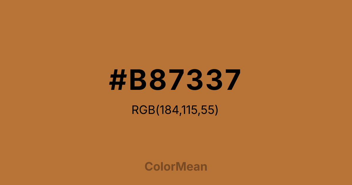 #B87337 RGB value is (184, 115, 55). The hex color red value is 184, green is 115, and blue is 55. Its HSL format shows a hue of 28°, saturation of 54 percent, and lightness of 47 percent. The CMYK process values are 0 percent, 38 percent, 70 percent, 28 percent.
