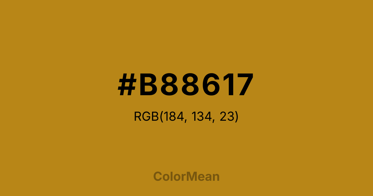 #B88617 RGB value is (184, 134, 23). The hex color red value is 184, green is 134, and blue is 23. Its HSL format shows a hue of 41°, saturation of 78 percent, and lightness of 41 percent. The CMYK process values are 0 percent, 27 percent, 88 percent, 28 percent.
