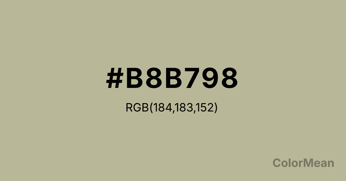 #B8B798 RGB value is (184, 183, 152). The hex color red value is 184, green is 183, and blue is 152. Its HSL format shows a hue of 58°, saturation of 18 percent, and lightness of 66 percent. The CMYK process values are 0 percent, 1 percent, 17 percent, 28 percent.