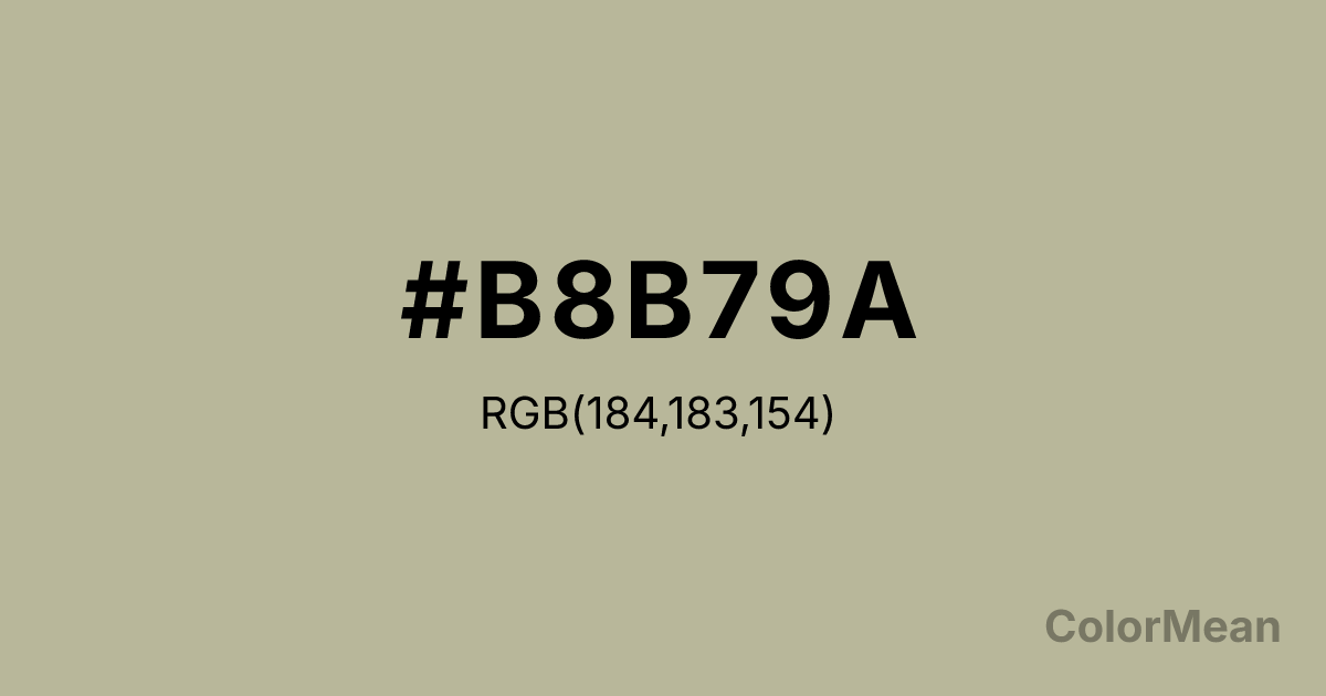 #B8B79A RGB value is (184, 183, 154). The hex color red value is 184, green is 183, and blue is 154. Its HSL format shows a hue of 58°, saturation of 17 percent, and lightness of 66 percent. The CMYK process values are 0 percent, 1 percent, 16 percent, 28 percent.