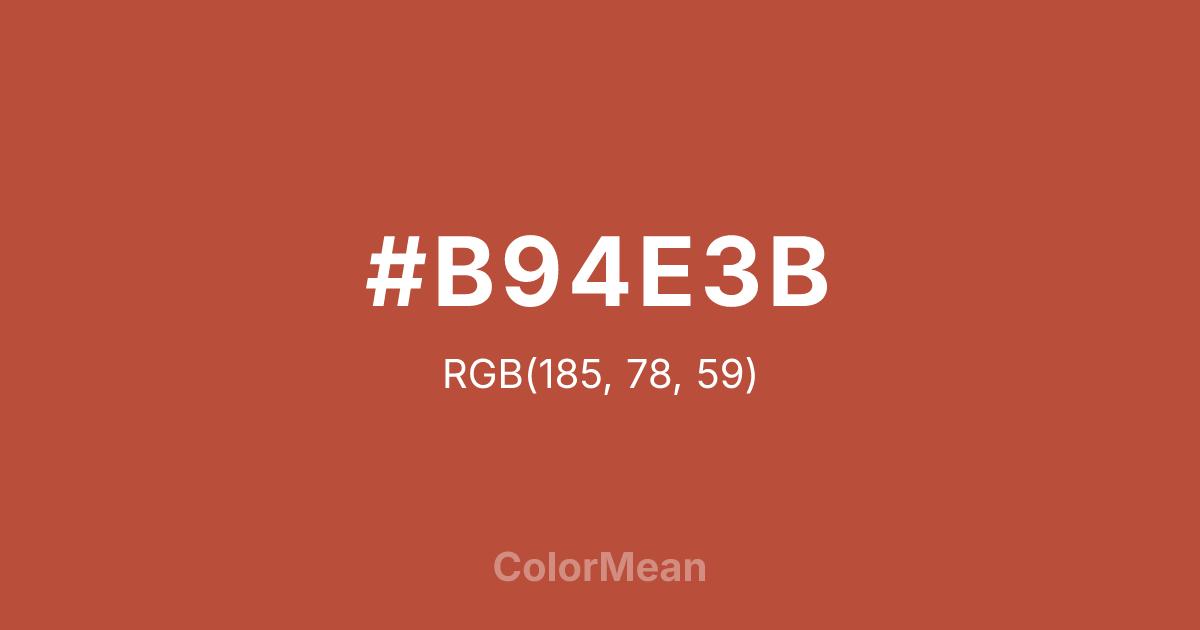#B94E3B RGB value is (185, 78, 59). The hex color red value is 185, green is 78, and blue is 59. Its HSL format shows a hue of 9°, saturation of 52 percent, and lightness of 48 percent. The CMYK process values are 0 percent, 58 percent, 68 percent, 27 percent.