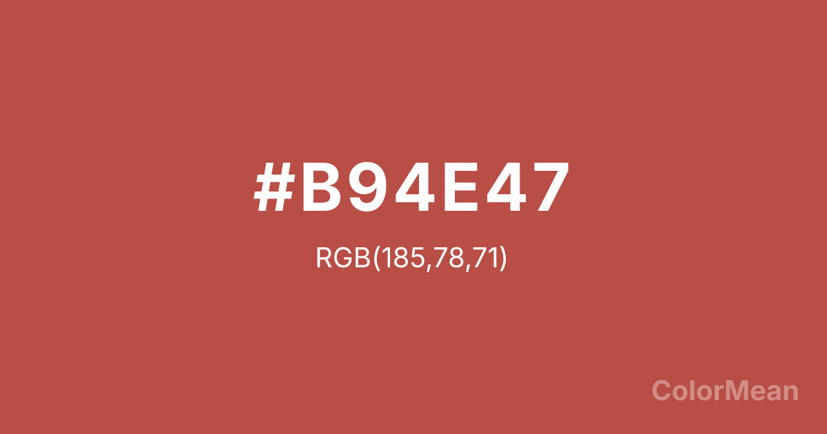 #B94E47 RGB value is (185, 78, 71). The hex color red value is 185, green is 78, and blue is 71. Its HSL format shows a hue of 4°, saturation of 45 percent, and lightness of 50 percent. The CMYK process values are 0 percent, 58 percent, 62 percent, 27 percent.