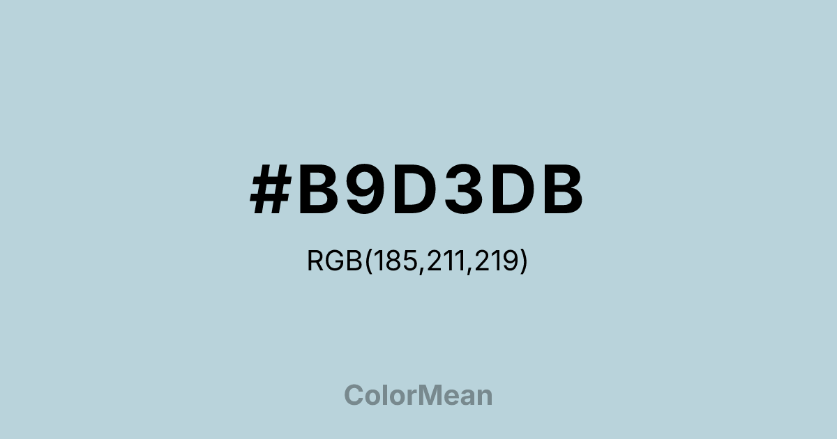 #B9D3DB RGB value is (185, 211, 219). The hex color red value is 185, green is 211, and blue is 219. Its HSL format shows a hue of 194°, saturation of 32 percent, and lightness of 79 percent. The CMYK process values are 16 percent, 4 percent, 0 percent, 14 percent.