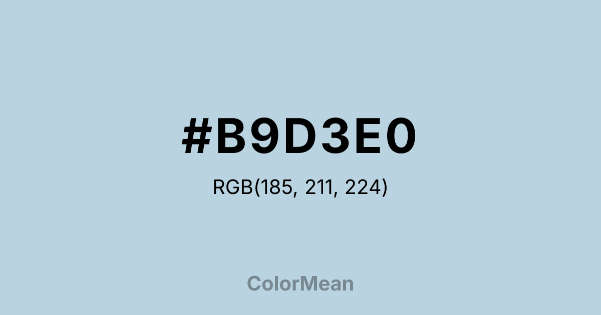 #B9D3E0 RGB value is (185, 211, 224). The hex color red value is 185, green is 211, and blue is 224. Its HSL format shows a hue of 200°, saturation of 39 percent, and lightness of 80 percent. The CMYK process values are 17 percent, 6 percent, 0 percent, 12 percent.