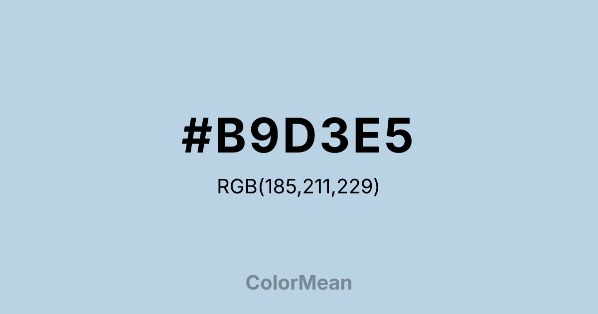 #B9D3E5 RGB value is (185, 211, 229). The hex color red value is 185, green is 211, and blue is 229. Its HSL format shows a hue of 205°, saturation of 46 percent, and lightness of 81 percent. The CMYK process values are 19 percent, 8 percent, 0 percent, 10 percent.