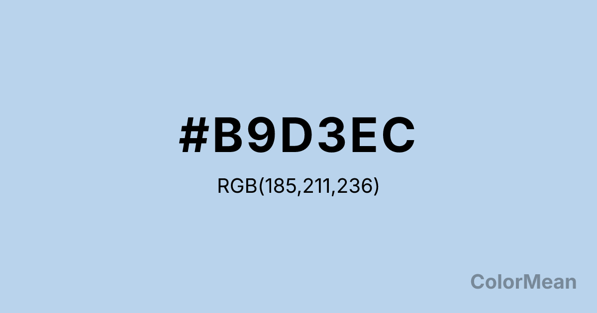 #B9D3EC RGB value is (185, 211, 236). The hex color red value is 185, green is 211, and blue is 236. Its HSL format shows a hue of 209°, saturation of 57 percent, and lightness of 83 percent. The CMYK process values are 22 percent, 11 percent, 0 percent, 7 percent.