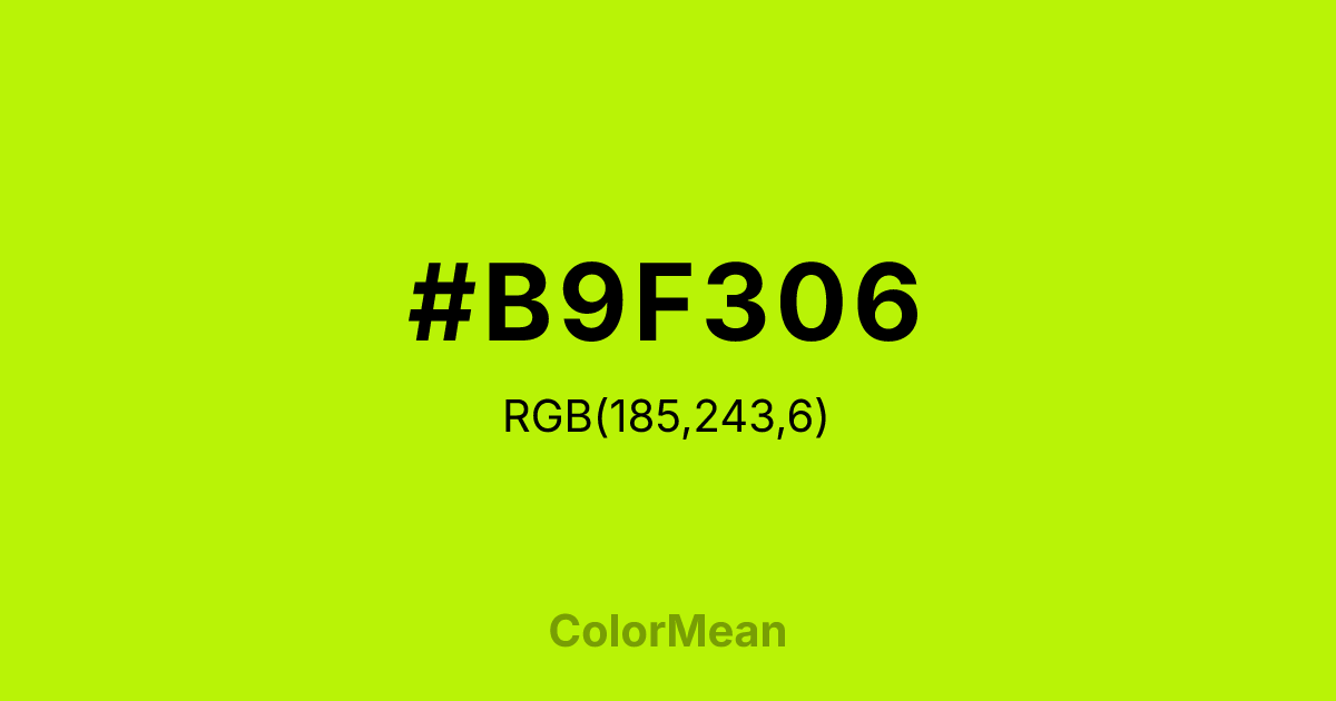 #B9F306 RGB value is (185, 243, 6). The hex color red value is 185, green is 243, and blue is 6. Its HSL format shows a hue of 75°, saturation of 95 percent, and lightness of 49 percent. The CMYK process values are 24 percent, 0 percent, 98 percent, 5 percent.