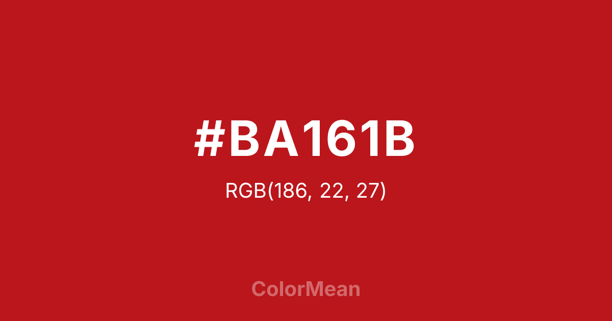 #BA161B RGB value is (186, 22, 27). The hex color red value is 186, green is 22, and blue is 27. Its HSL format shows a hue of 358°, saturation of 79 percent, and lightness of 41 percent. The CMYK process values are 0 percent, 88 percent, 85 percent, 27 percent.