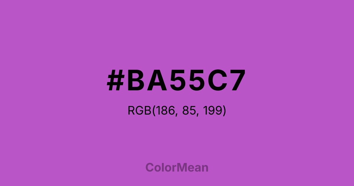 #BA55C7 RGB value is (186, 85, 199). The hex color red value is 186, green is 85, and blue is 199. Its HSL format shows a hue of 293°, saturation of 50 percent, and lightness of 56 percent. The CMYK process values are 7 percent, 57 percent, 0 percent, 22 percent.