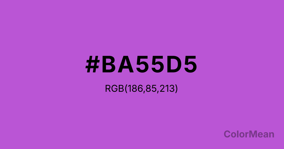 #BA55D5 RGB value is (186, 85, 213). The hex color red value is 186, green is 85, and blue is 213. Its HSL format shows a hue of 287°, saturation of 60 percent, and lightness of 58 percent. The CMYK process values are 13 percent, 60 percent, 0 percent, 16 percent.
