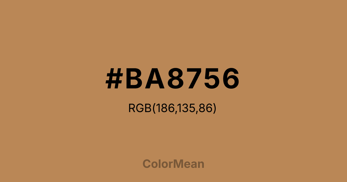 #BA8756 RGB value is (186, 135, 86). The hex color red value is 186, green is 135, and blue is 86. Its HSL format shows a hue of 29°, saturation of 42 percent, and lightness of 53 percent. The CMYK process values are 0 percent, 27 percent, 54 percent, 27 percent.