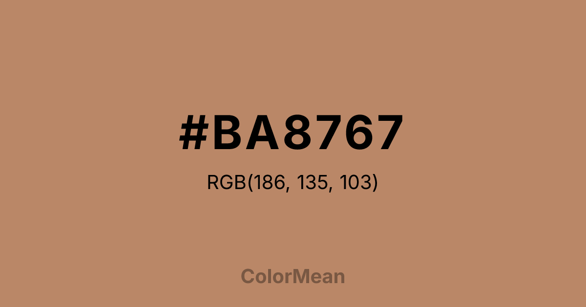 #BA8767 RGB value is (186, 135, 103). The hex color red value is 186, green is 135, and blue is 103. Its HSL format shows a hue of 23°, saturation of 38 percent, and lightness of 57 percent. The CMYK process values are 0 percent, 27 percent, 45 percent, 27 percent.