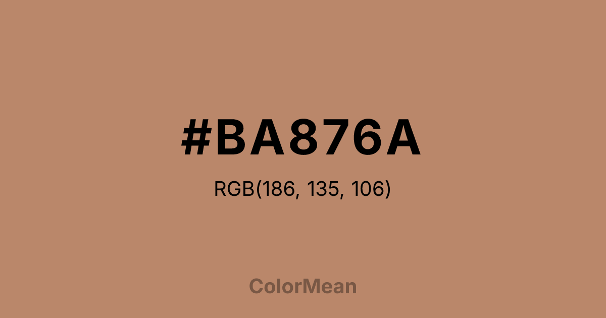 #BA876A RGB value is (186, 135, 106). The hex color red value is 186, green is 135, and blue is 106. Its HSL format shows a hue of 22°, saturation of 37 percent, and lightness of 57 percent. The CMYK process values are 0 percent, 27 percent, 43 percent, 27 percent.