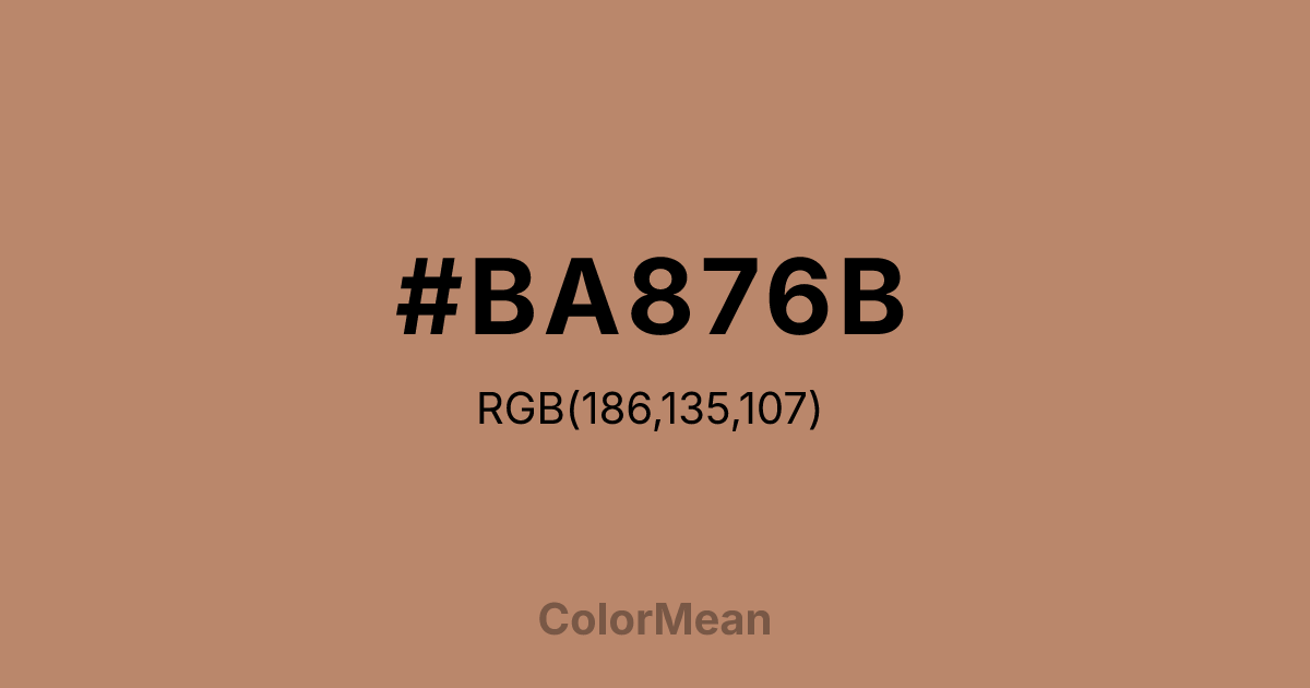 #BA876B RGB value is (186, 135, 107). The hex color red value is 186, green is 135, and blue is 107. Its HSL format shows a hue of 21°, saturation of 36 percent, and lightness of 57 percent. The CMYK process values are 0 percent, 27 percent, 42 percent, 27 percent.